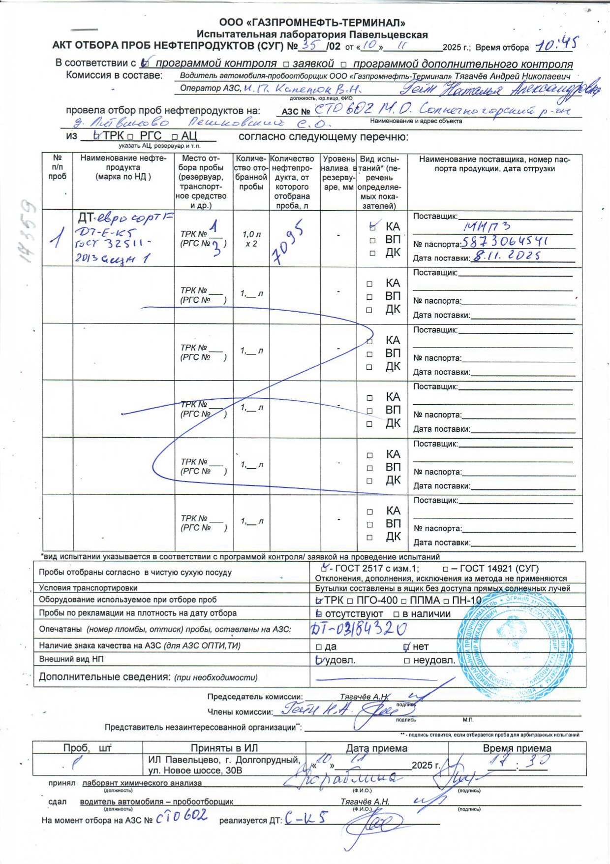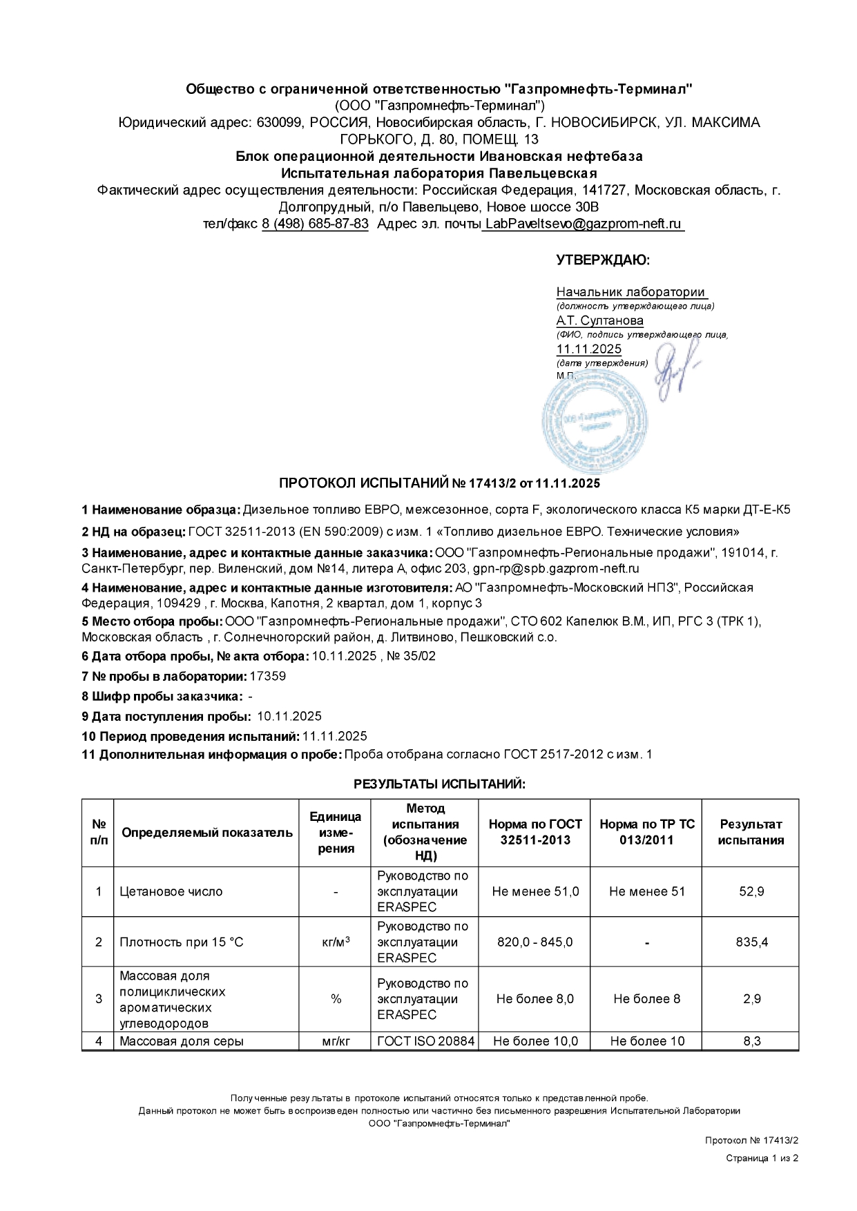 - 10 ноября 2025 года передвижной лабораторией ООО "ГАЗПРОМНЕФТЬ-ТЕРМИНАЛ" было проверено качество дизельного топлива, реализуемого на наших АЗС. После проведенных анализов лаборатория выдала заключение: