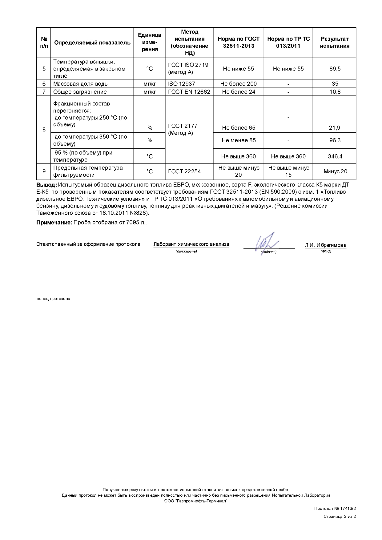 Дизельное топливо ЕВРО, межсезонное, сорта F, экологического класса К5 марки ДТ-Е-К5 соответствует требованиям ГОСТ 32511-2013 (EN 590:2009) с изм. 1 "Топливо дизельное ЕВРО. Технические условия" и ТР ТС 013/2011 "О требованиях к автомобильному и авиационному бензину, дизельному и судовому топливу, топливу для реактивных двигателей и мазуту".